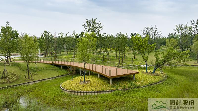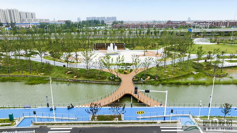 水系貫穿整段綠地,綠道、景觀橋穿插其中,沿途設(shè)置平臺(tái)、廊架等,充分呼應(yīng)水網(wǎng)與路網(wǎng)交織主題。水系駁岸既有草坡入水,又有仿木樁駁岸,點(diǎn)綴景石,搭配疏密相間的綠化,共同形成了生態(tài)多樣的生態(tài)水岸。